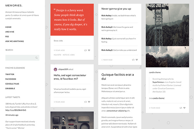 Memories is a beautiful grid theme for Tumblr, with an array of different customisation options to make it your own personal design.